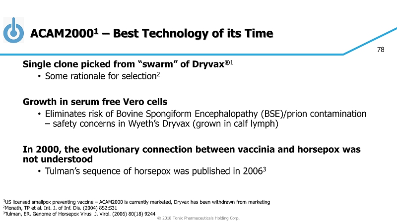 © 2018 Tonix Pharmaceuticals Holding Corp. 77 Given that smallpox is eradicated the only evidence of effectiveness for modern vaccines is from historical use when smallpox was endemic • Stimulates interest in the evolution of vaccinia Vaccinia stocks around the world diverged from Jenner’s 1798 vaccine • Evolutionary argument that common progenitor was horsepox or a similar virus U.S. vaccine from 1902 was found to be 99.7% similar to horsepox in core viral sequence 1 • Strong evidence linking a horsepox - like virus as progenitor to modern vaccinia • Effectiveness of older vaccines support belief that HPXV will be protective against smallpox Evidence of Effectiveness for Smallpox Vaccine 1 Schrick, L. et al (2017) An Early American Smallpox Vaccine Based on Horsepox N Engl J Med 2017; 377:1491