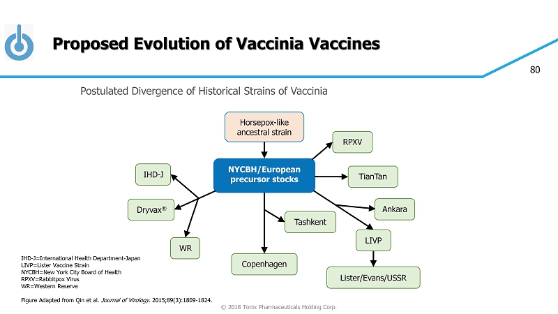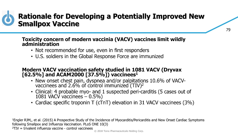 © 2018 Tonix Pharmaceuticals Holding Corp. 79 Toxicity concern of modern vaccinia (VACV) vaccines limit wildly administration • Not recommended for use, even in first responders • U.S. soldiers in the Global Response Force are immunized Modern VACV vaccination safety studied in 1081 VACV ( Dryvax [62.5%] and ACAM2000 [37.5%]) vaccinees 1 • New onset chest pain, dyspnea and/or palpitations 10.6% of VACV - vaccinees and 2.6% of control immunized (TIV) 2 • Clinical: 4 probable myo - and 1 suspected peri - carditis (5 cases out of 1081 VACV vaccinees – 0.5%) • Cardiac specific troponin T ( cTnT ) elevation in 31 VACV vaccinees (3%) Rationale for Developing a Potentially Improved New Smallpox Vaccine 1 Engler RJM,, et al. (2015) A Prospective Study of the Incidence of Myocarditis/Pericarditis and New Onset Cardiac Symptoms following Smallpox and Influenza Vaccination. PLoS ONE 10(3) 2 TIV = trivalent influenza vaccine - control vaccinees