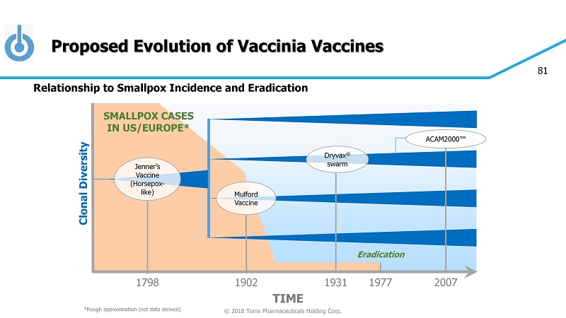 © 2018 Tonix Pharmaceuticals Holding Corp. 80 Postulated Divergence of Historical Strains of Vaccinia Proposed Evolution of Vaccinia Vaccines NYCBH/European precursor stocks Horsepox - like ancestral strain Lister/Evans/USSR Dryvax ® IHD - J WR Copenhagen Tashkent RPXV TianTan Ankara LIVP IHD - J=International Health Department - Japan LIVP=Lister Vaccine Strain NYCBH=New York City Board of Health RPXV=Rabbitpox Virus WR=Western Reserve Figure Adapted from Qin et al. Journal of Virology. 2015;89(3):1809 - 1824.