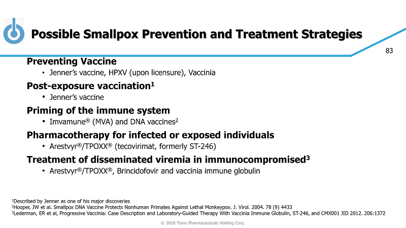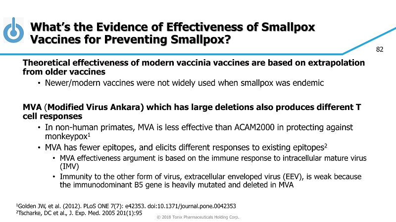© 2018 Tonix Pharmaceuticals Holding Corp. 82 Theoretical effectiveness of modern vaccinia vaccines are based on extrapolation from older vaccines • Newer/modern vaccines were not widely used when smallpox was endemic MVA ( Modified Virus Ankara) which has large deletions also produces different T cell responses • In non - human primates, MVA is less effective than ACAM2000 in protecting against monkeypox 1 • MVA has fewer epitopes, and elicits different responses to existing epitopes 2 • MVA effectiveness argument is based on the immune response to intracellular mature virus (IMV) • Immunity to the other form of virus, extracellular enveloped virus (EEV), is weak because the immunodominant B5 gene is heavily mutated and deleted in MVA What’s the Evidence of Effectiveness of Smallpox Vaccines for Preventing Smallpox? 1 Golden JW, et al. (2012). PLoS ONE 7(7): e42353. doi:10.1371/journal.pone.0042353 2 Tscharke, DC et al., J. Exp. Med. 2005 201(1):95