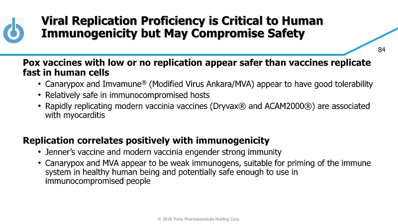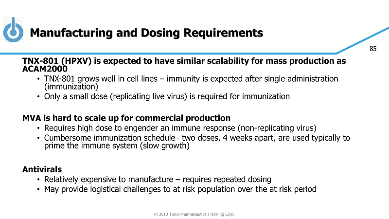 © 2018 Tonix Pharmaceuticals Holding Corp. 84 Pox vaccines with low or no replication appear safer than vaccines replicate fast in human cells • Canarypox and Imvamune ® (Modified Virus Ankara/MVA) appear to have good tolerability • Relatively safe in immunocompromised hosts • Rapidly replicating modern vaccinia vaccines ( Dryvax ® and ACAM2000®) are associated with myocarditis Replication correlates positively with immunogenicity • Jenner’s vaccine and modern vaccinia engender strong immunity • Canarypox and MVA appear to be weak immunogens, suitable for priming of the immune system in healthy human being and potentially safe enough to use in immunocompromised people Viral Replication Proficiency is Critical to Human Immunogenicity but May Compromise Safety
