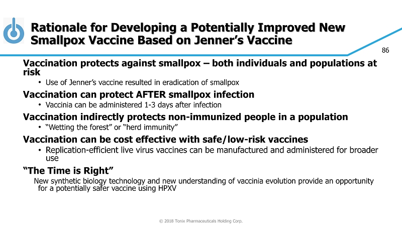 © 2018 Tonix Pharmaceuticals Holding Corp. 85 TNX - 801 (HPXV) is expected to have similar scalability for mass production as ACAM2000 • TNX - 801 grows well in cell lines – immunity is expected after single administration (immunization) • Only a small dose (replicating live virus) is required for immunization MVA is hard to scale up for commercial production • Requires high dose to engender an immune response (non - replicating virus) • Cumbersome immunization schedule – two doses, 4 weeks apart, are used typically to prime the immune system (slow growth) Antivirals • Relatively expensive to manufacture – requires repeated dosing • May provide logistical challenges to at risk population over the at risk period Manufacturing and Dosing Requirements