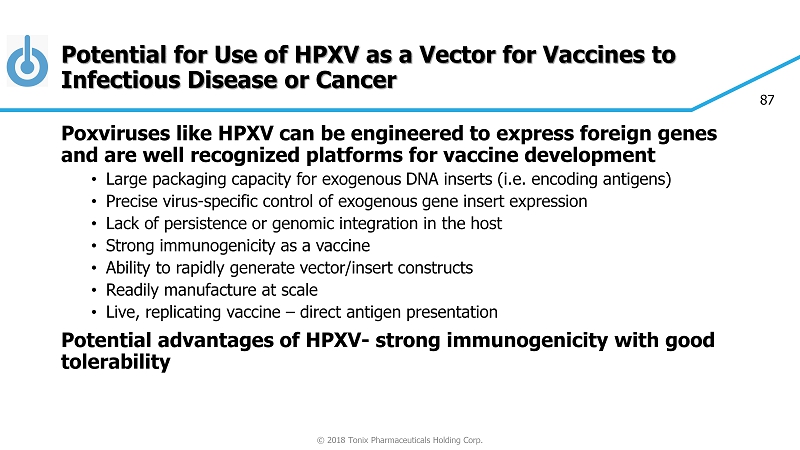 © 2018 Tonix Pharmaceuticals Holding Corp. 87 Potential for Use of HPXV as a Vector for Vaccines to Infectious Disease or Cancer Poxviruses like HPXV can be engineered to express foreign genes and are well recognized platforms for vaccine development • Large packaging capacity for exogenous DNA inserts (i.e. encoding antigens) • Precise virus - specific control of exogenous gene insert expression • Lack of persistence or genomic integration in the host • Strong immunogenicity as a vaccine • Ability to rapidly generate vector/insert constructs • Readily manufacture at scale • Live, replicating vaccine – direct antigen presentation Potential advantages of HPXV - strong immunogenicity with good tolerability