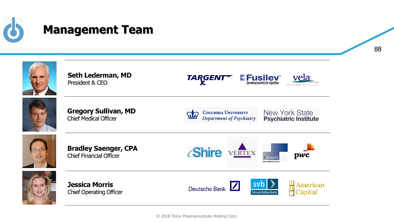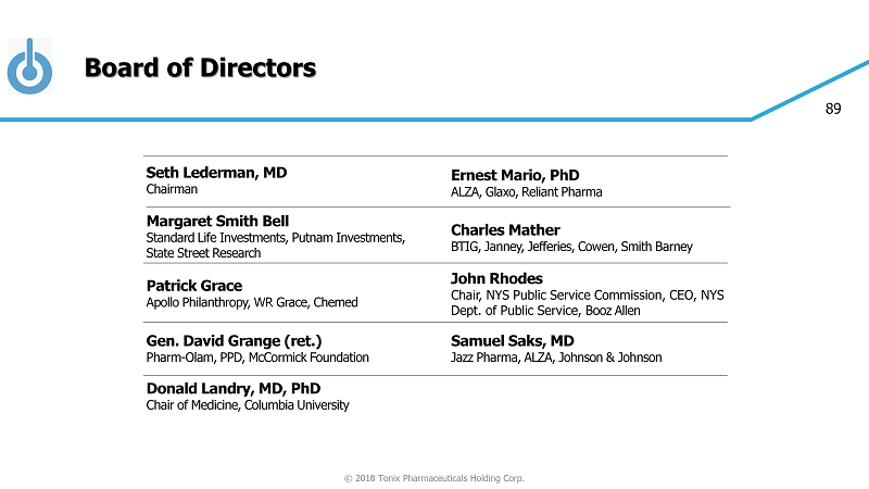 © 2018 Tonix Pharmaceuticals Holding Corp. 88 Management Team Seth Lederman, MD President & CEO Jessica Morris Chief Operating Officer Gregory Sullivan, MD Chief Medical Officer Bradley Saenger, CPA Chief Financial Officer