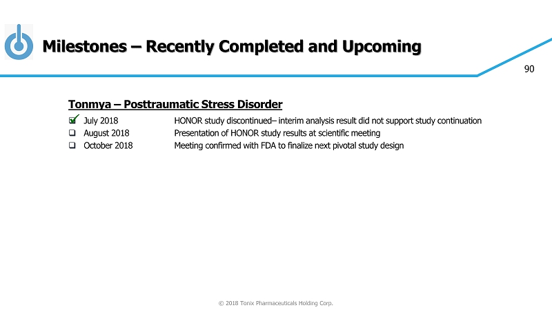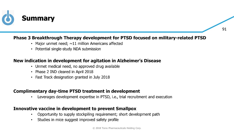 © 2018 Tonix Pharmaceuticals Holding Corp. 90 Milestones – Recently Completed and Upcoming T onmya – Posttraumatic Stress Disorder □ July 201 8 HONOR study discontinued – interim analysis result did not support study continuation □ August 201 8 Presentation of HONOR study results at scientific meeting □ October 201 8 Meeting confirmed with FDA to finalize next pivotal study design x