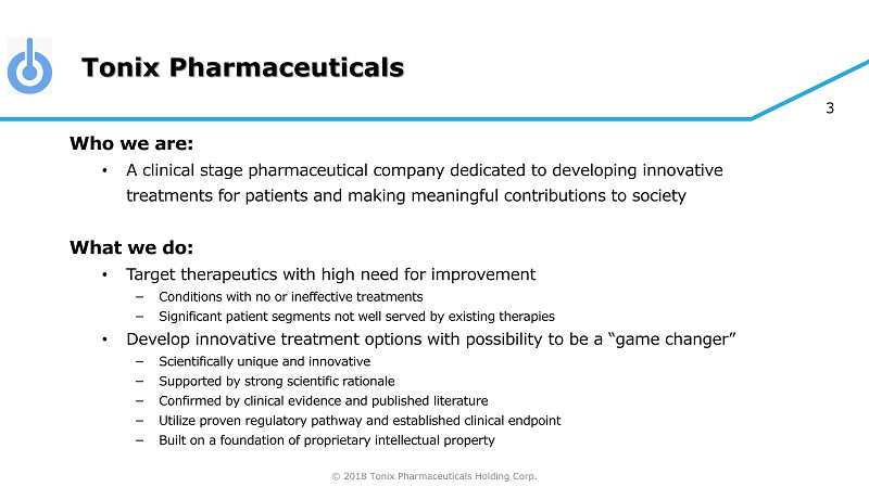 © 2018 Tonix Pharmaceuticals Holding Corp. 2 Cautionary Note on Forward - Looking Statements Certain statements in this presentation regarding strategic plans, expectations and objectives for future operations or results are “forward - looking statements” as defined by the Private Securities Litigation Reform Act of 1995 . These statements may be identified by the use of forward - looking words such as “anticipate,” “believe,” “forecast,” “estimate” and “intend,” among others . These forward - looking statements are based on Tonix’s current expectations and actual results could differ materially . There are a number of factors that could cause actual events to differ materially from those indicated by such forward - looking statements . These factors include, but are not limited to, substantial competition ; our need for additional financing ; uncertainties of patent protection and litigation ; uncertainties of government or third party payor reimbursement ; limited research and development efforts and dependence upon third parties ; and risks related to failure to obtain U . S . Food and Drug Administration clearances or approvals and noncompliance with its regulations . As with any pharmaceutical under development, there are significant risks in the development, regulatory approval and commercialization of new products . The forward - looking statements in this presentation are made as of the date of this presentation, even if subsequently made available by Tonix on its website or otherwise . Tonix does not undertake an obligation to update or revise any forward - looking statement, except as required by law . Investors should read the risk factors set forth in the Annual Report on Form 10 - K for the year ended December 31 , 2017 , as filed with the Securities and Exchange Commission (the “SEC”) on March 9 , 2018 , and periodic reports filed with the SEC on or after the date thereof . All of Tonix’s forward - looking statements are expressly qualified by all such risk factors and other cautionary statements .