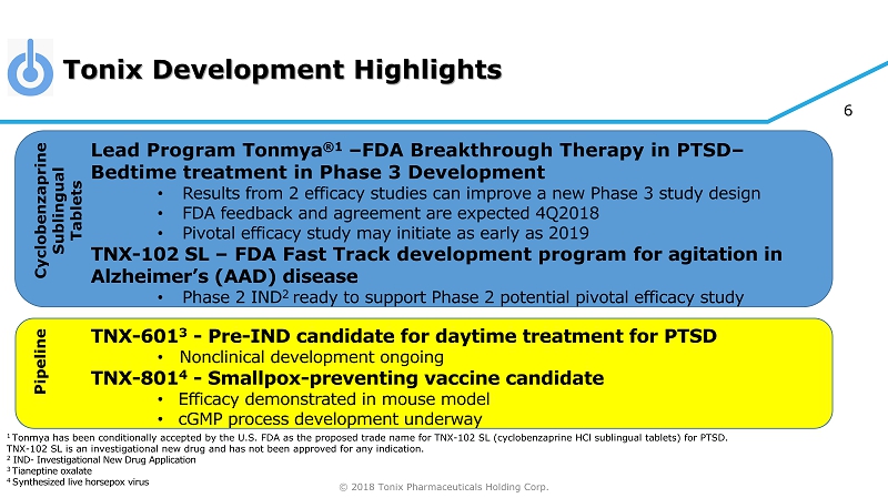 © 2018 Tonix Pharmaceuticals Holding Corp. 5 Lead Program: TNX - 102 SL – Product Concept Sleep disturbances are associated with a constellation of disorders • Considered co - morbid or a key symptom in these disorders • Believed to have a role in the onset, progression and severity of these disorders The focus of TNX - 102 SL development is both unique and innovative • Testing the therapeutic benefit of sleep (’sleep quality’) − Restorative sleep…in contrast to time spent sleeping (’sleep quantity’) • Targeting clinical conditions for which improved sleep quality may have a therapeutic benefit − Reduction in disease - specific symptoms, with sleep improvement as a secondary endpoint