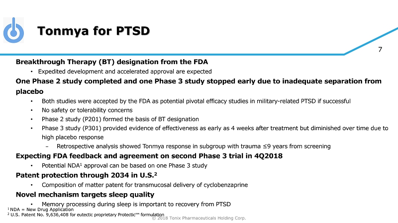 © 2018 Tonix Pharmaceuticals Holding Corp. 6 Lead Program Tonmya ®1 – FDA Breakthrough Therapy in PTSD – Bedtime treatment in Phase 3 Development • Results from 2 efficacy studies can improve a new Phase 3 study design • FDA feedback and agreement are expected 4Q2018 • Pivotal efficacy study may initiate as early as 2019 TNX - 102 SL – FDA Fast Track development program for agitation in Alzheimer’s (AAD) disease • Phase 2 IND 2 ready to support Phase 2 potential pivotal efficacy study TNX - 601 3 - Pre - IND candidate for daytime treatment for PTSD • Nonclinical development ongoing TNX - 801 4 - Smallpox - preventing vaccine candidate • Efficacy demonstrated in mouse model • cGMP process development underway 1 Tonmya has been conditionally accepted by the U.S. FDA as the proposed trade name for TNX - 102 SL (cyclobenzaprine HCl sublingual tablets) for PTSD. TNX - 102 SL is an investigational new drug and has not been approved for any indication. 2 IND - Investigational New Drug Application 3 T ianeptine oxalate 4 S ynthesized live horsepox virus Tonix Development Highlights Cyclobenzaprine Sublingual Tablets Pipeline