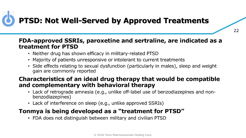 © 2018 Tonix Pharmaceuticals Holding Corp. 21 What Drug Classes are Used to Treat PTSD? * TRx = Total prescriptions 1 VA/DoD Clinical Practice Guideline for the Management of Post - Traumatic Stress, Version 2, 2010 2 IMS Consulting, Market Sizing & Treatment Dynamics: “Post - Traumatic Stress Disorder (PTSD) Patients”, 2016 Benzodiazepines 2.845 M TRx SSRIs 2.839 M TRx Other Antidepressants Non - benzodiazepine Hypnotics Serotonin and norepinephrine reuptake inhibitors (SNRIs) Tricyclic Antidepressants Adrenergic Agents All Others Atypical Antipsychotics Anticonvulsants/Mood Stabilizers Market highly fragmented, with benzodiazepines widely prescribed (but not indicated) 1 • Multiple medications per patient (or “Polypharmacy”) is the norm • Approximately 55% of patients receive a benzodiazepine, and 53% receive a selective serotonin reuptake inhibitor (SSRI) • SSRIs are the only FDA - approved drug class Estimated PTSD Market Volume (Civilian Population Only) ~14.1 million TRx * 2