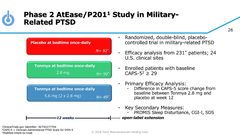 © 2018 Tonix Pharmaceuticals Holding Corp. 25 Growing Economic and Social Burden to Care for Veterans with PTSD Health care costs associated with PTSD for OEF/OIF/OND veterans: Direct costs Indirect costs 1 CBO Report 2012; 2 Tanielan , Invisible Wounds of War . 2005; 3 Analysis of VA Health Care Utilization among Operation Enduring Freedom, Operation Iraqi Freedom, and Operation New Dawn Veterans, from 1st Qtr FY 2002 through 2nd Qtr FY 2015, Washington, DC ; OEF/OIF/OND, Operations Enduring Freedom, Iraqi Freedom and New Dawn. $3,000 - 5,000 per patient per year for OEF/OIF Veterans 1 ~ 1.9M Veterans out of 2.7M Service members deployed between 10/1/2001 and 3/31/2015 3 $2 - 3 billion estimated yearly cost to society 2 Families, social care agencies, schools, employers, welfare system 2