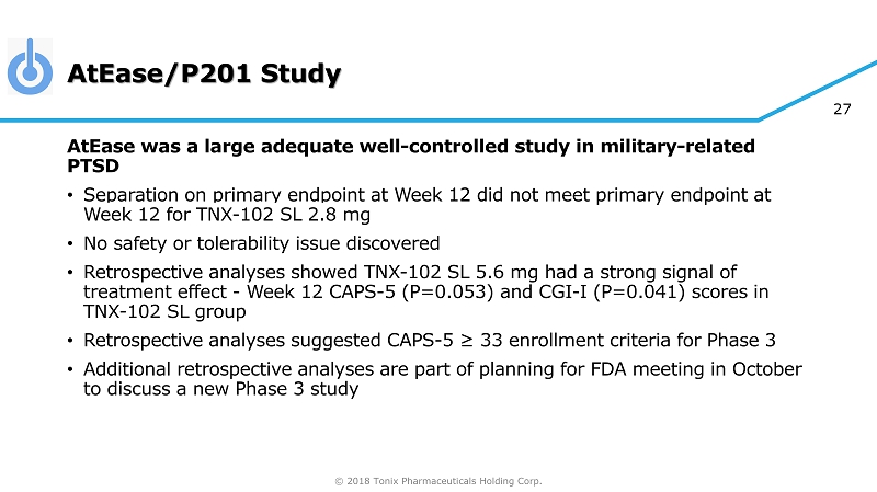© 2018 Tonix Pharmaceuticals Holding Corp. 26 Phase 2 AtEase/P201 1 Study in Military - Related PTSD • Randomized, double - blind, placebo - controlled trial in military - related PTSD • Efficacy analysis from 231 * patients; 24 U.S. clinical sites • Enrolled patients with baseline CAPS - 5 2 ≥ 29 • Primary Efficacy Analysis: • Difference in CAPS - 5 score change from baseline between Tonmya 2.8 mg and placebo at week 12 • Key Secondary Measures: • PROMIS Sleep Disturbance, CGI - I, SDS Tonmya at bedtime once - daily Placebo at bedtime once - daily 12 weeks N= 90 * Tonmya at bedtime once - daily N= 92 * N= 49 * 2.8 mg 5.6 mg (2 x 2.8 mg) open - label extension 1 ClinicalTrials.gov Identifier: NCT02277704 2 CAPS - 5 = Clinician - Administered PTSD Scale for DSM - 5 * Modified intent - to - treat