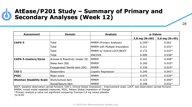 © 2018 Tonix Pharmaceuticals Holding Corp. 27 AtEase/P201 Study AtEase was a large adequate well - controlled study in military - related PTSD • Separation on primary endpoint at Week 12 did not meet primary endpoint at Week 12 for TNX - 102 SL 2.8 mg • No safety or tolerability issue discovered • Retrospective analyses showed TNX - 102 SL 5.6 mg had a strong signal of treatment effect - Week 12 CAPS - 5 (P=0.053) and CGI - I (P=0.041) scores in TNX - 102 SL group • Retrospective analyses suggested CAPS - 5 ≥ 33 enrollment criteria for Phase 3 • Additional retrospective analyses are part of planning for FDA meeting in October to discuss a new Phase 3 study