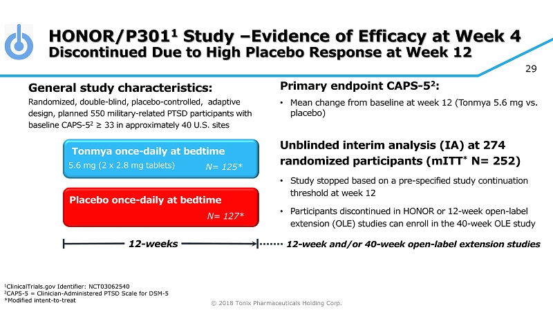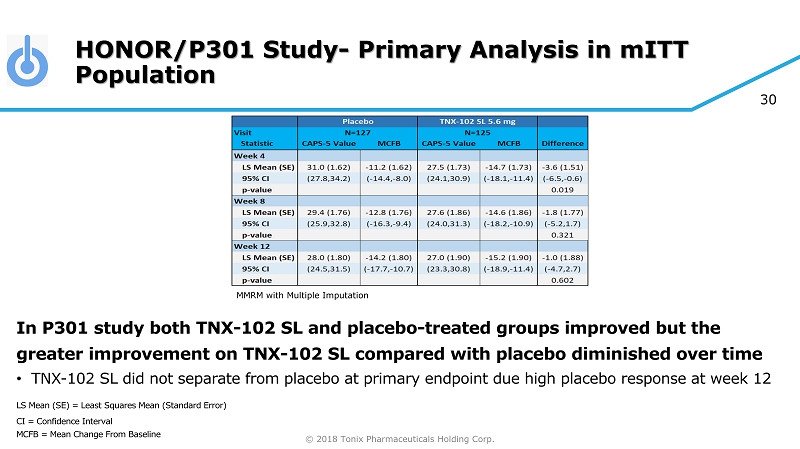 © 2018 Tonix Pharmaceuticals Holding Corp. 29 HONOR/P301 1 Study – Evidence of Efficacy at Week 4 Discontinued Due to High Placebo Response at Week 12 Primary e ndpoint CAPS - 5 2 : • Mean change from baseline at w eek 12 (Tonmya 5.6 mg vs. placebo ) Unblinded interim analysis (IA) at 274 randomized participants ( mITT * N= 252) • Study stopped based on a pre - specified study continuation threshold at week 12 • Participants discontinued in HONOR or 12 - week open - label extension (OLE) studies can enroll in the 40 - week OLE study Placebo once - daily at bedtime 12 - weeks Tonmya once - daily at bedtime N= 127* N= 125* 5.6 mg (2 x 2.8 mg tablets) General s tudy c haracteristics: Randomized, double - blind, placebo - controlled , adaptive design, planned 550 military - related PTSD participants with baseline CAPS - 5 2 ≥ 33 in approximately 40 U.S. sites 12 - week and/or 40 - week open - label extension studies 1 ClinicalTrials.gov Identifier: NCT03062540 2 CAPS - 5 = Clinician - Administered PTSD Scale for DSM - 5 *Modified intent - to - treat