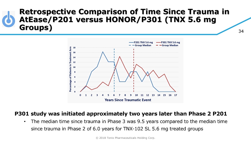 © 2018 Tonix Pharmaceuticals Holding Corp. 33 AtEase/P201 and HONOR/P301 Demographics and Characteristics The striking difference between P201 and P301 was time since trauma • Phase 2 AtEase P201 study recruited many participants from the surge in Iraq who were mostly <9 years since trauma