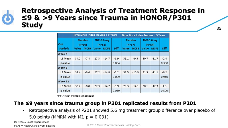 © 2018 Tonix Pharmaceuticals Holding Corp. 34 Retrospective Comparison of Time Since Trauma in AtEase/P201 versus HONOR/P301 (TNX 5.6 mg Groups) P301 study was initiated approximately two years later than Phase 2 P201 • The median time since trauma in Phase 3 was 9.5 years compared to the median time since trauma in Phase 2 of 6.0 years for TNX - 102 SL 5.6 mg treated groups