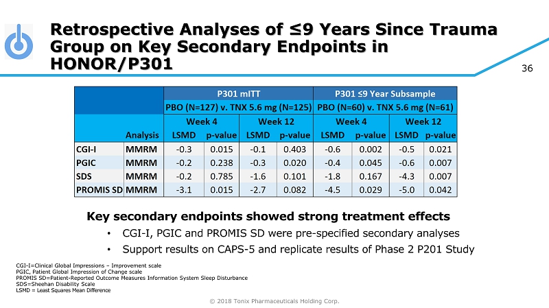 © 2018 Tonix Pharmaceuticals Holding Corp. 35 Retrospective Analysis of Treatment Response in ≤9 & >9 Years since Trauma in HONOR/P301 Study The ≤ 9 years since trauma group in P301 replicated results from P201 • Retrospective analysis of P201 showed 5.6 mg treatment group difference over placebo of 5.0 points (MMRM with MI, p = 0.031) LS Mean = Least Squares Mean MCFB = Mean Change From Baseline MMRM with Multiple Imputation