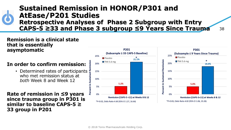 © 2018 Tonix Pharmaceuticals Holding Corp. 37 Adverse Events (AEs) in AtEase/P201 and HONOR/P301 *# No serious and unexpected AEs in P301 or P201 • Systemic AEs comparable between studies and also consistent with those described in approved product labeling • Similar severity and incidence of oral hypoesthesia (oral numbness) # only adverse events (AEs) are listed that are at a rate of ≥ 5% in any TNX - treated group *no values in a row for either study means the AE in the active group(s) in that study was at a rate of <5%