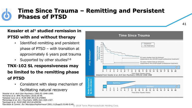 © 2018 Tonix Pharmaceuticals Holding Corp. 40 Time Since Trauma – Review of Published Studies Published studies of prazosin suggested effects in military - PTSD prior to 9 years • Loss of treatment effect >9 years Paroxetine and sertraline studies supporting FDA approval were conducted on PTSD > 9 years • SSRIs have a benefit long after trauma 1 Martenyi et al. J Clin Psychiatry 2002;63:199 - 206. 2 Friedman et al. J Clin Psychiatry 2007;68:711 - 720. 3 Raskind et al. NEJM 2018;378:507 - 517. 4 Raskind et al. Am J Psychiatry 2013;170:1003 - 1010. 5 Shalev et al. Arch Gen Psychiatry 2012;69:166 - 176. 6 Davidson et al. Arch Gen Psychiatry 2001;58:485 - 492. 7 Brady et al. JAMA 2000;283:1837 - 1844. 8 Marshall et al. Am J Psychiatry 2001;158:1982 - 1988. 9 Tucker et al. J Clin Psychiatry 2001;62:860 - 868. Escit =escitalopram; Sert =sertraline;