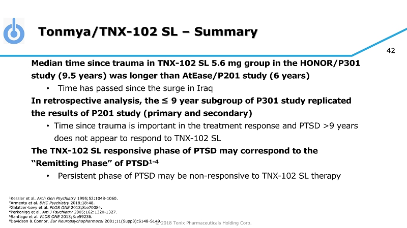 © 2018 Tonix Pharmaceuticals Holding Corp. 41 Time Since Trauma – Remitting and Persistent Phases of PTSD Kessler et al 1 studied remission in PTSD with and without therapy • Identified remitting and persistent phase of PTSD – with transition at approximately 6 years post trauma • Supported by other studies 2 - 6 TNX - 102 SL responsiveness may be limited to the remitting phase of PTSD • Consistent with sleep mechanism of facilitating natural recovery 1 Kessler et al. Arch Gen Psychiatry 1995;52:1048 - 1060. 2 Armenta et al. BMC Psychiatry 2018;18:48. 3 Galatzer - Levy et al. PLOS ONE 2013;8:e70084. 4 Perkonigg et al. Am J Psychiatry 2005;162:1320 - 1327. 5 Santiago et al. PLOS ONE 2013;8:e59236. 6 Davidson & Connor. Eur Neuropsychopharmacol 2001;11(Supp3):S148 - S149. Adapted from Kessler et al. Arch Gen Psychiatry 1995;52:1048 - 1060