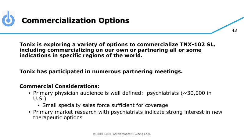 © 2018 Tonix Pharmaceuticals Holding Corp. 43 Commercialization Options Tonix is exploring a variety of options to commercialize TNX - 102 SL, including commercializing on our own or partnering all or some indications in specific regions of the world. Tonix has participated in numerous partnering meetings. Commercial Considerations: • Primary physician audience is well defined: psychiatrists (~30,000 in U.S.) • Small specialty sales force sufficient for coverage • Primary market research with psychiatrists indicate strong interest in new therapeutic options