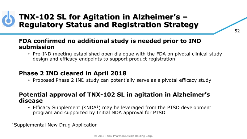 © 2018 Tonix Pharmaceuticals Holding Corp. 51 Agitation in Alzheimer’s Disease – Additional Indication Being Developed for TNX - 102 SL FDA designated Fast Track development program Significant unmet need • No FDA approved drugs for the treatment of agitation in Alzheimer’s Mechanism of improving sleep quality • Sleep disturbance is a significant and common symptoms in Alzheimer’s Pharmacological advantages outweigh potential concerns of using TNX - 102 SL in treating agitation in Alzheimer’s disease • Blocks 3 receptors, not just one (e.g., 5 - HT 2A )