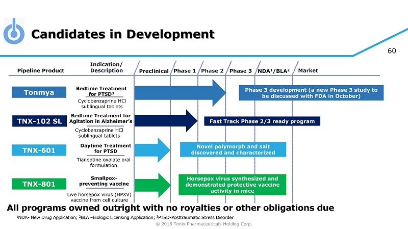 © 2018 Tonix Pharmaceuticals Holding Corp. 60 Candidates in Development Preclinical Phase 2 NDA 1 /BLA 2 Market Pipeline Product Indication/ Description Phase 3 Tonmya Bedtime Treatment for PTSD 3 Daytime Treatment for PTSD TNX - 601 Novel polymorph and salt discovered and characterized TNX - 801 Horsepox virus synthesized and demonstrated protective vaccine activity in mice Smallpox - preventing vaccine Cyclobenzaprine HCl sublingual tablets Tianeptine oxalate oral formulation Live horsepox virus (HPXV) vaccine from cell culture Phase 1 1 NDA - New Drug Application; 2 BLA – Biologic Licensing Application; 3 PTSD - Posttraumatic Stress Disorder Bedtime Treatment for Agitation in Alzheimer’s Cyclobenzaprine HCl sublingual tablets Fast Track Phase 2/3 ready program TNX - 102 SL All programs owned outright with no royalties or other obligations due Phase 3 development (a new Phase 3 study to be discussed with FDA in October)