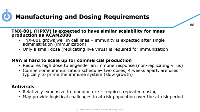 © 2018 Tonix Pharmaceuticals Holding Corp. 87 Pox vaccines with low or no replication appear safer than vaccines replicate fast in human cells • Canarypox and Imvamune ® (Modified Virus Ankara/MVA) appear to have good tolerability • Relatively safe in immunocompromised hosts • Rapidly replicating modern vaccinia vaccines ( Dryvax ® and ACAM2000®) are associated with myocarditis Replication correlates positively with immunogenicity • Jenner’s vaccine and modern vaccinia engender strong immunity • Canarypox and MVA appear to be weak immunogens, suitable for priming of the immune system in healthy human being and potentially safe enough to use in immunocompromised people Viral Replication Proficiency is Critical to Human Immunogenicity but May Compromise Safety
