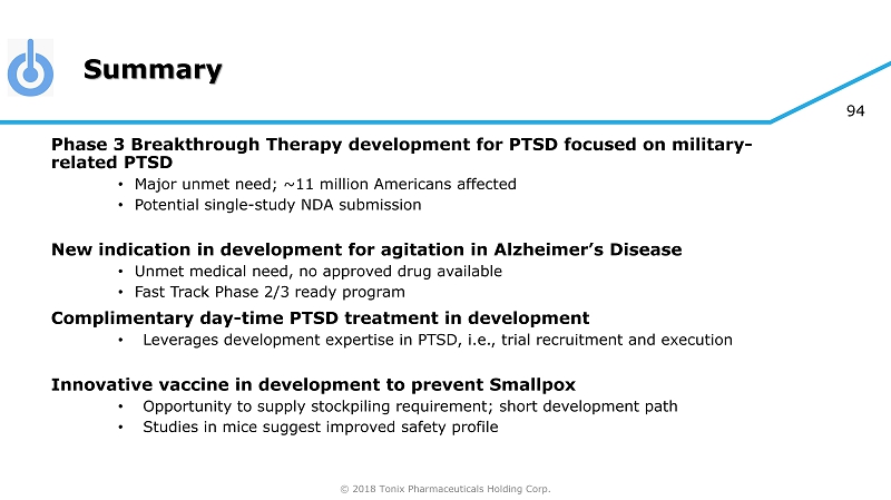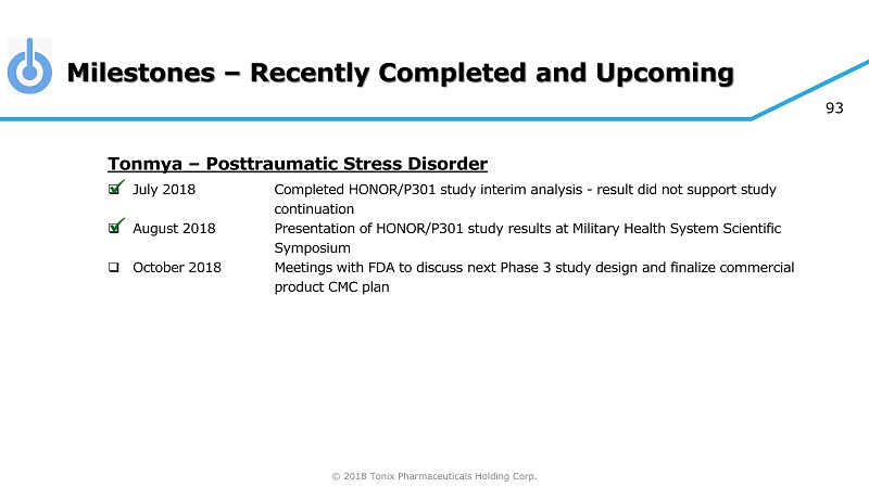 © 2018 Tonix Pharmaceuticals Holding Corp. 93 Milestones – Recently Completed and Upcoming T onmya – Posttraumatic Stress Disorder □ July 201 8 Completed HONOR/P301 study interim analysis - result did not support study continuation □ August 201 8 Presentation of HONOR/P301 study results at Military Health System Scientific Symposium □ October 201 8 Meetings with FDA to discuss next Phase 3 study design and finalize commercial product CMC plan x x
