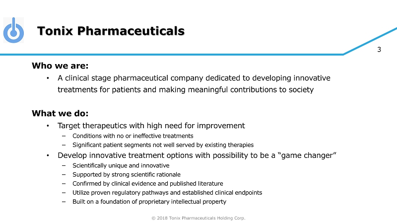 © 2018 Tonix Pharmaceuticals Holding Corp. 2 Cautionary Note on Forward - Looking Statements Certain statements in this presentation regarding strategic plans, expectations and objectives for future operations or results are “forward - looking statements” as defined by the Private Securities Litigation Reform Act of 1995 . These statements may be identified by the use of forward - looking words such as “anticipate,” “believe,” “forecast,” “estimate” and “intend,” among others . These forward - looking statements are based on Tonix’s current expectations and actual results could differ materially . There are a number of factors that could cause actual events to differ materially from those indicated by such forward - looking statements . These factors include, but are not limited to, substantial competition ; our need for additional financing ; uncertainties of patent protection and litigation ; uncertainties of government or third party payor reimbursement ; limited research and development efforts and dependence upon third parties ; and risks related to failure to obtain U . S . Food and Drug Administration clearances or approvals and noncompliance with its regulations . As with any pharmaceutical under development, there are significant risks in the development, regulatory approval and commercialization of new products . The forward - looking statements in this presentation are made as of the date of this presentation, even if subsequently made available by Tonix on its website or otherwise . Tonix does not undertake an obligation to update or revise any forward - looking statement, except as required by law . Investors should read the risk factors set forth in the Annual Report on Form 10 - K for the year ended December 31 , 2017 , as filed with the Securities and Exchange Commission (the “SEC”) on March 9 , 2018 , and periodic reports filed with the SEC on or after the date thereof . All of Tonix's forward - looking statements are expressly qualified by all such risk factors and other cautionary statements .