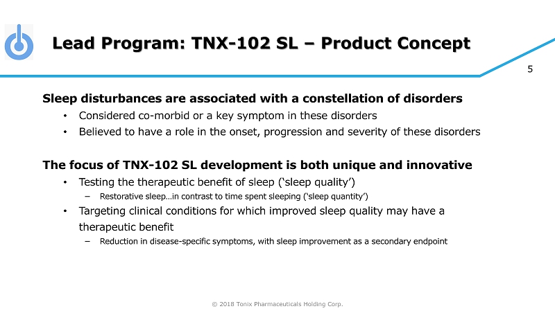 © 2018 Tonix Pharmaceuticals Holding Corp. 4 Candidates in Development Preclinical Phase 2 NDA 1 /BLA 2 Market Pipeline Product Indication/ Description Phase 3 Tonmya Bedtime Treatment for PTSD 3 Daytime Treatment for PTSD TNX - 601 Novel polymorph and salt discovered and characterized TNX - 801 Horsepox virus synthesized and demonstrated protective vaccine activity in mice Smallpox - preventing vaccine Cyclobenzaprine HCl sublingual tablets Tianeptine oxalate oral formulation Live horsepox virus (HPXV) vaccine from cell culture Phase 1 1 NDA - New Drug Application; 2 BLA – Biologic Licensing Application; 3 PTSD - Posttraumatic Stress Disorder Bedtime Treatment for Agitation in Alzheimer’s Cyclobenzaprine HCl sublingual tablets Fast Track Phase 2/3 ready program TNX - 102 SL All programs owned outright with no royalties or other obligations due Phase 3 development (a new Phase 3 study to be discussed with FDA in October)