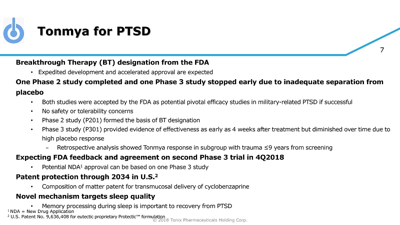 © 2018 Tonix Pharmaceuticals Holding Corp. 6 Lead Program Tonmya ®1 – FDA Breakthrough Therapy in PTSD – Bedtime treatment in Phase 3 Development • Results from 2 efficacy studies can improve a new Phase 3 study design • FDA feedback and agreement are expected 4Q2018 • Pivotal efficacy study may initiate as early as 2019 TNX - 102 SL – FDA Fast Track development program for agitation in Alzheimer’s (AAD) disease • Phase 2 IND 2 ready to support Phase 2 potential pivotal efficacy study TNX - 601 3 - Pre - IND candidate for daytime treatment for PTSD • Nonclinical development ongoing TNX - 801 4 - Smallpox - preventing vaccine candidate • Efficacy demonstrated in mouse model • cGMP process development underway 1 Tonmya has been conditionally accepted by the U.S. FDA as the proposed trade name for TNX - 102 SL (cyclobenzaprine HCl sublingual tablets) for PTSD. TNX - 102 SL is an investigational new drug and has not been approved for any indication. 2 IND - Investigational New Drug Application 3 T ianeptine oxalate 4 S ynthesized live horsepox virus Tonix Development Highlights Cyclobenzaprine Sublingual Tablets Pipeline