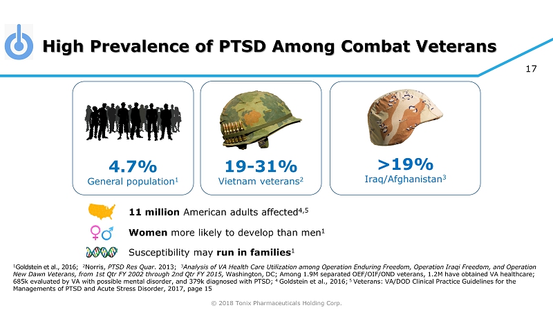 © 2018 Tonix Pharmaceuticals Holding Corp. 16 PTSD: Not Well - Served by Approved Treatments FDA - approved SSRIs, paroxetine and sertraline, are indicated as a treatment for PTSD • Neither drug has shown efficacy in military - related PTSD • Majority of patients unresponsive or intolerant to current treatments • Side effects relating to sexual dysfunction (particularly in males), sleep and weight gain are commonly reported Characteristics of an ideal drug therapy that would be compatible and complementary with behavioral therapy • Lack of retrograde amnesia (e.g., unlike off - label use of benzodiazepines and non - benzodiazepines) • Lack of interference on sleep (e.g., unlike approved SSRIs) Tonmya is being developed as a “treatment for PTSD” • FDA does not distinguish between military and civilian PTSD