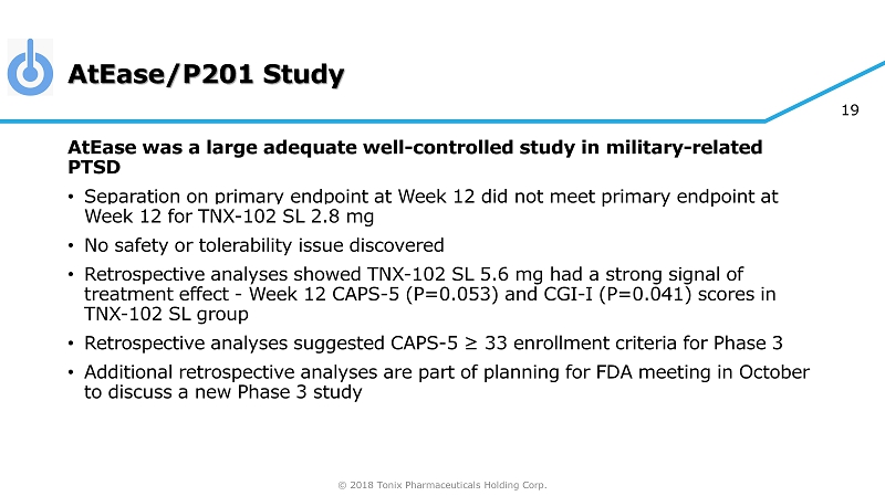 © 2018 Tonix Pharmaceuticals Holding Corp. 18 Phase 2 AtEase/P201 1 Study in Military - Related PTSD • Randomized, double - blind, placebo - controlled trial in military - related PTSD • Efficacy analysis from 231 * patients; 24 U.S. clinical sites • Enrolled patients with baseline CAPS - 5 2 ≥ 29 • Primary Efficacy Analysis: • Difference in CAPS - 5 score change from baseline between Tonmya 2.8 mg and placebo at week 12 • Key Secondary Measures: • PROMIS Sleep Disturbance, CGI - I, SDS Tonmya at bedtime once - daily Placebo at bedtime once - daily 12 weeks N= 90 * Tonmya at bedtime once - daily N= 92 * N= 49 * 2.8 mg 5.6 mg (2 x 2.8 mg) open - label extension 1 ClinicalTrials.gov Identifier: NCT02277704 2 CAPS - 5 = Clinician - Administered PTSD Scale for DSM - 5 * Modified intent - to - treat
