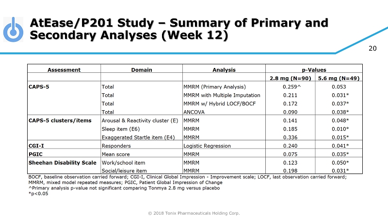 © 2018 Tonix Pharmaceuticals Holding Corp. 19 AtEase/P201 Study AtEase was a large adequate well - controlled study in military - related PTSD • Separation on primary endpoint at Week 12 did not meet primary endpoint at Week 12 for TNX - 102 SL 2.8 mg • No safety or tolerability issue discovered • Retrospective analyses showed TNX - 102 SL 5.6 mg had a strong signal of treatment effect - Week 12 CAPS - 5 (P=0.053) and CGI - I (P=0.041) scores in TNX - 102 SL group • Retrospective analyses suggested CAPS - 5 ≥ 33 enrollment criteria for Phase 3 • Additional retrospective analyses are part of planning for FDA meeting in October to discuss a new Phase 3 study