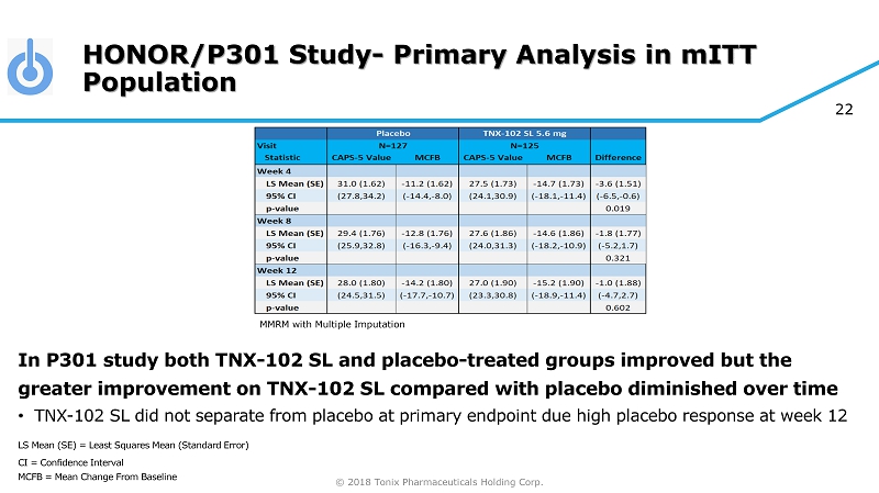 © 2018 Tonix Pharmaceuticals Holding Corp. 21 HONOR/P301 1 Study – Evidence of Efficacy at Week 4 Discontinued Due to High Placebo Response at Week 12 Primary e ndpoint CAPS - 5 2 : • Mean change from baseline at w eek 12 (Tonmya 5.6 mg vs. placebo ) Unblinded interim analysis (IA) at 274 randomized participants ( mITT * N= 252) • Study stopped based on a pre - specified study continuation threshold at week 12 • Participants discontinued in HONOR or 12 - week open - label extension (OLE) studies can enroll in the 40 - week OLE study Placebo once - daily at bedtime 12 - weeks Tonmya once - daily at bedtime N= 127* N= 125* 5.6 mg (2 x 2.8 mg tablets) General s tudy c haracteristics: Randomized, double - blind, placebo - controlled , adaptive design, planned 550 military - related PTSD participants with baseline CAPS - 5 2 ≥ 33 in approximately 40 U.S. sites 12 - week and/or 40 - week open - label extension studies 1 ClinicalTrials.gov Identifier: NCT03062540 2 CAPS - 5 = Clinician - Administered PTSD Scale for DSM - 5 *Modified intent - to - treat