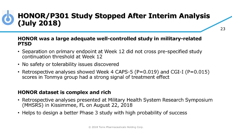 © 2018 Tonix Pharmaceuticals Holding Corp. 22 HONOR/P301 Study - Primary Analysis in mITT Population In P301 study both TNX - 102 SL and placebo - treated groups improved but the greater improvement on TNX - 102 SL compared with placebo diminished over time • TNX - 102 SL did not separate from placebo at primary endpoint due high placebo response at week 12 LS Mean (SE) = Least Squares Mean (Standard Error) CI = Confidence Interval MCFB = Mean Change From Baseline MMRM with Multiple Imputation
