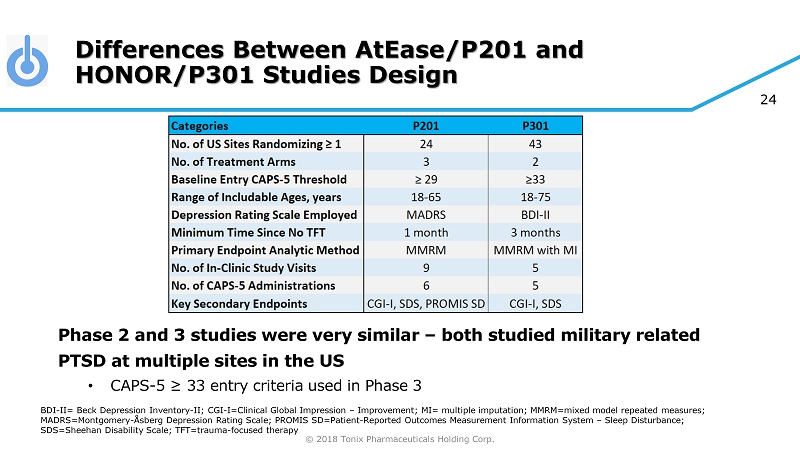 © 2018 Tonix Pharmaceuticals Holding Corp. 23 HONOR/P301 Study Stopped After Interim Analysis (July 2018) HONOR was a large adequate well - controlled study in military - related PTSD • Separation on primary endpoint at Week 12 did not cross pre - specified study continuation threshold at Week 12 • No safety or tolerability issues discovered • Retrospective analyses showed Week 4 CAPS - 5 (P=0.019) and CGI - I (P=0.015) scores in Tonmya group had a strong signal of treatment effect HONOR dataset is complex and rich • Retrospective analyses presented at Military Health System Research Symposium (MHSRS) in Kissimmee, FL on August 22, 2018 • Helps to design a better Phase 3 study with high probability of success