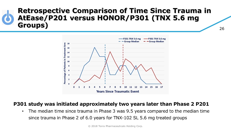 © 2018 Tonix Pharmaceuticals Holding Corp. 25 AtEase/P201 and HONOR/P301 Demographics and Characteristics The striking difference between P201 and P301 was time since trauma • Phase 2 AtEase P201 study recruited many participants from the surge in Iraq who were mostly <9 years since trauma