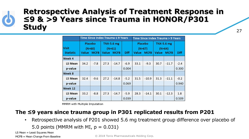 © 2018 Tonix Pharmaceuticals Holding Corp. 26 Retrospective Comparison of Time Since Trauma in AtEase/P201 versus HONOR/P301 (TNX 5.6 mg Groups) P301 study was initiated approximately two years later than Phase 2 P201 • The median time since trauma in Phase 3 was 9.5 years compared to the median time since trauma in Phase 2 of 6.0 years for TNX - 102 SL 5.6 mg treated groups