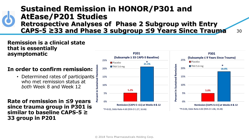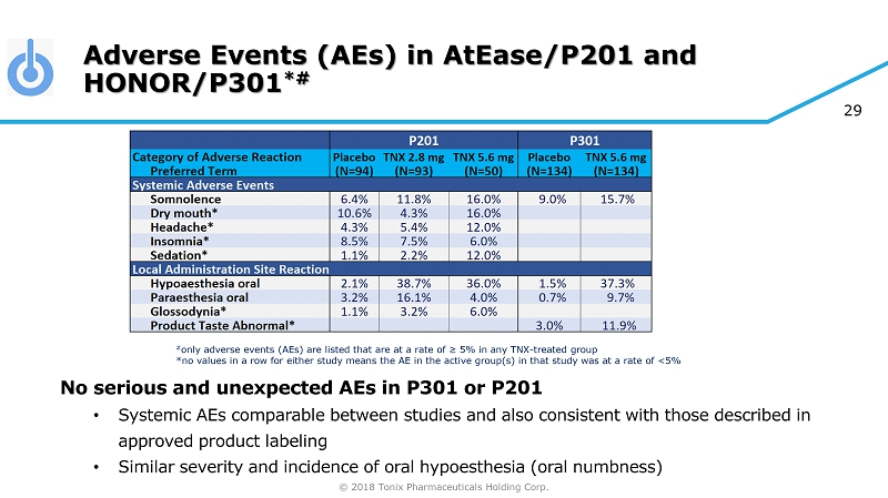 © 2018 Tonix Pharmaceuticals Holding Corp. 29 Adverse Events (AEs) in AtEase/P201 and HONOR/P301 *# No serious and unexpected AEs in P301 or P201 • Systemic AEs comparable between studies and also consistent with those described in approved product labeling • Similar severity and incidence of oral hypoesthesia (oral numbness) # only adverse events (AEs) are listed that are at a rate of ≥ 5% in any TNX - treated group *no values in a row for either study means the AE in the active group(s) in that study was at a rate of <5%