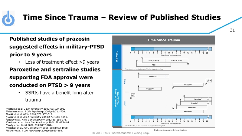 © 2018 Tonix Pharmaceuticals Holding Corp. 30 Sustained Remission in HONOR/P301 and AtEase/P201 Studies Retrospective Analyses of Phase 2 Subgroup with Entry CAPS - 5 ≥33 and Phase 3 subgroup ≤9 Years Since Trauma Remission is a clinical state that is essentially asymptomatic In order to confirm remission: • Determined rates of participants who met remission status at both Week 8 and Week 12 Rate of remission in ≤9 years since trauma group in P301 is similar to baseline CAPS - 5 ≥ 33 group in P201