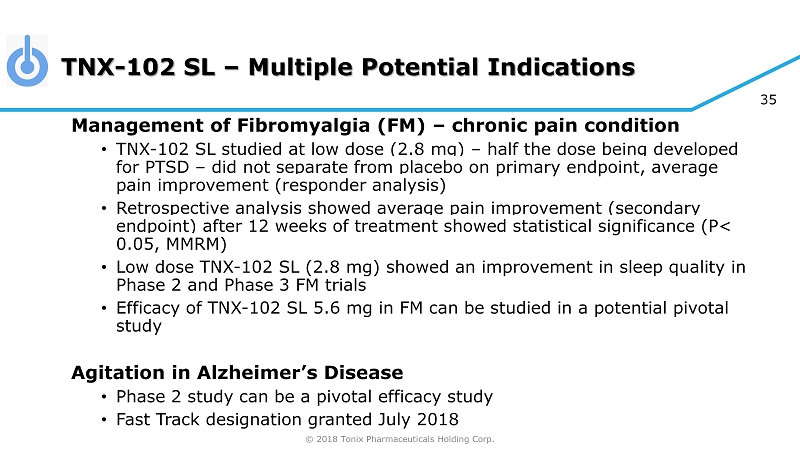 © 2018 Tonix Pharmaceuticals Holding Corp. 34 Commercialization Options Tonix is exploring a variety of options to commercialize TNX - 102 SL, including commercializing on our own or partnering all or some indications in specific regions of the world. Tonix has participated in numerous partnering meetings. Commercial Considerations: • Primary physician audience is well defined: psychiatrists (~30,000 in U.S.) • Small specialty sales force sufficient for coverage • Primary market research with psychiatrists indicate strong interest in new therapeutic options