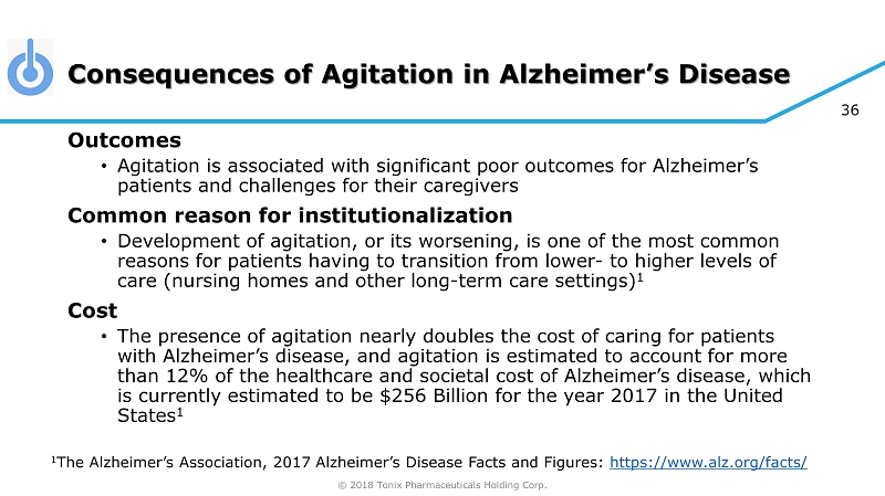 © 2018 Tonix Pharmaceuticals Holding Corp. 35 TNX - 102 SL – Multiple Potential Indications Ma nagement of Fibromyalgia (FM) – chronic pain condition • TNX - 102 SL studied at low dose (2.8 mg) – half the dose being developed for PTSD – did not separate from placebo on primary endpoint, average pain improvement (responder analysis) • Retrospective analysis showed average pain improvement (secondary endpoint) after 12 weeks of treatment showed statistical significance (P< 0.05, MMRM) • Low dose TNX - 102 SL (2.8 mg) showed an improvement in sleep quality in Phase 2 and Pha se 3 FM trials • Efficacy of TNX - 102 SL 5.6 mg in FM can be studied in a potential pivotal study Agitation in Alzheimer’s Disease • Phase 2 study can be a pivotal efficacy study • Fast Track designation granted July 2018