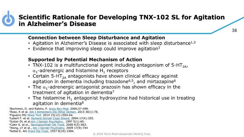 © 2018 Tonix Pharmaceuticals Holding Corp. 38 Scientific Rationale for Developing TNX - 102 SL for Agitation in Alzheimer’s Disease Connection between Sleep Disturbance and Agitation • Agitation in Alzheimer’s Disease is associated with sleep disturbance 1,2 • Evidence that improving sleep could improve agitation 3 Supported by Potential Mechanism of Action • TNX - 102 is a multifunctional agent including antagonism of 5 - HT 2A , a 1 - adrenergic and histamine H 1 receptors • Certain 5 - HT 2A antagonists have shown clinical efficacy against agitation in dementia including trazodone 4,5 , and mirtazapine 6 • The a 1 - adrenergic antagonist prazosin has shown efficacy in the treatment of agitation in dementia 7 • The histamine H 1 antagonist hydroxyzine had historical use in treating agitation in dementia 8 1 Bachmen, D. and Rabins , P. Annu Rev Med. 2006;57:499. 2 Rose, K et al. Am J Alzheimers Dis Other Demen . 2015 30(1):78. 3 Figueiro MG Sleep Med. 2014 15(12):1554 - 64. 4 Lebert F. et al. Dement Geriatr Cogn Disord . 2004:17(4):355. 5 Sulzer DL et al. Am J Geriatr Psychiatry. 1997 5(1):60. 6 Cakir S. et el., Neuropsychiatr Dis Treat. 2008 4(5):963. 7 Wang, LY et al., Am J Geriatr Psychiatry. 2009 17(9):744 8 Settel E. Am Pract Dig Treat. 1957 8(10):1584.