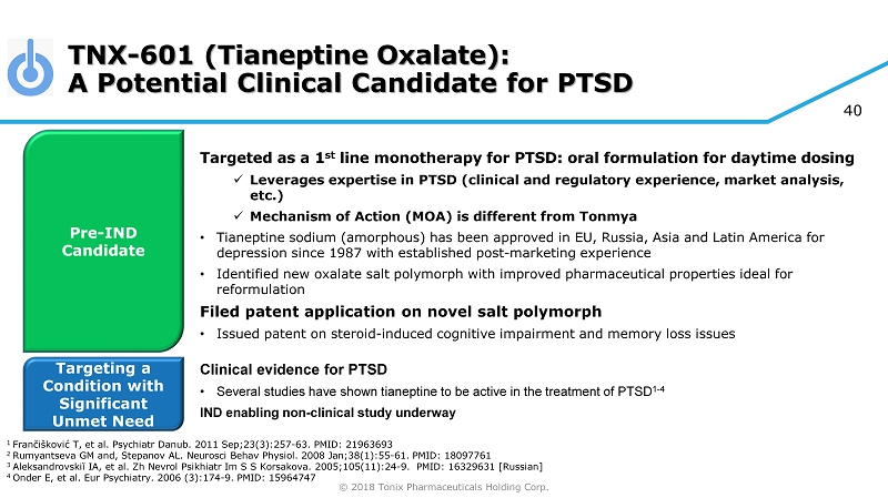 © 2018 Tonix Pharmaceuticals Holding Corp. 39 Candidates in Development Preclinical Phase 2 NDA 1 /BLA 2 Market Pipeline Product Indication/ Description Phase 3 Tonmya Bedtime Treatment for PTSD 3 Daytime Treatment for PTSD TNX - 601 Novel polymorph and salt discovered and characterized TNX - 801 Horsepox virus synthesized and demonstrated protective vaccine activity in mice Smallpox - preventing vaccine Cyclobenzaprine HCl sublingual tablets Tianeptine oxalate oral formulation Live horsepox virus (HPXV) vaccine from cell culture Phase 1 1 NDA - New Drug Application; 2 BLA – Biologic Licensing Application; 3 PTSD - Posttraumatic Stress Disorder Bedtime Treatment for Agitation in Alzheimer’s Cyclobenzaprine HCl sublingual tablets Fast Track Phase 2/3 ready program TNX - 102 SL All programs owned outright with no royalties or other obligations due Phase 3 development (a new Phase 3 study to be discussed with FDA in October)