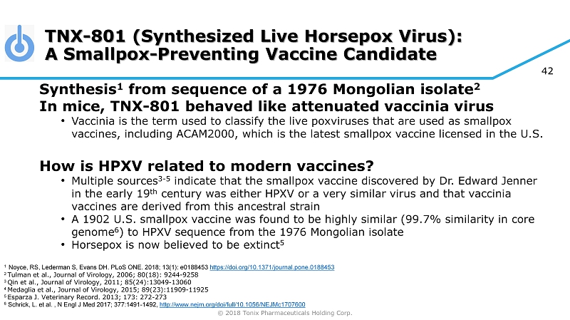 © 2018 Tonix Pharmaceuticals Holding Corp. 41 TNX - 801 (Synthesized Live Horsepox Virus): A Smallpox - Preventing Vaccine Candidate Pre - IND Stage Potential improvement over current biodefense tools against smallpox ✓ Leverages Tonix’s government affairs effort ✓ Collaboration with Professor David Evans and Dr. Ryan Noyce at University of Alberta ✓ Demonstrated protective vaccine activity in mice ✓ Patent application on novel vaccine submitted Regulatory strategy • We intend to meet with FDA to discuss the most efficient and appropriate investigational plan to support the licensure, either: ✓ Application of the “Animal Rule”, or ✓ Conducting an active comparator study using ACAM2000 • Good Manufacturing Practice (GMP) viral production process in development Targeting a Potential Public Health Issue Material threat medical countermeasure under 21 st Century Cures Act • Qualifies for Priority Review Voucher* (PRV) upon licensure ✓ PRVs have no expiration date, are transferrable and have sold for ~$125 M 1 PRV can be applied to any BLA/NDA for priority 6 - month review