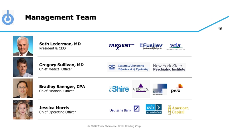 © 2018 Tonix Pharmaceuticals Holding Corp. 46 Management Team Seth Lederman, MD President & CEO Jessica Morris Chief Operating Officer Gregory Sullivan, MD Chief Medical Officer Bradley Saenger, CPA Chief Financial Officer