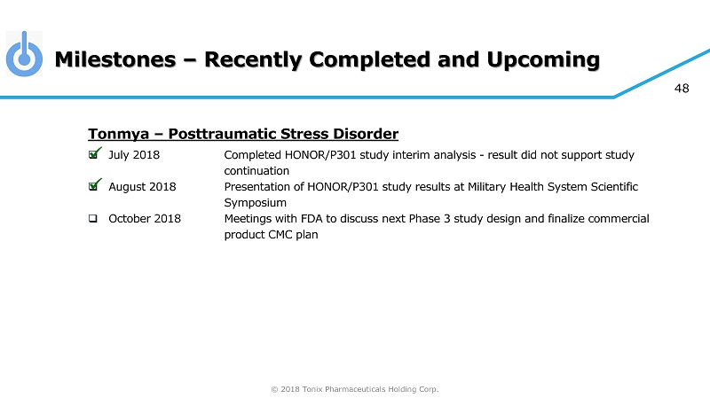 © 2018 Tonix Pharmaceuticals Holding Corp. 48 Milestones – Recently Completed and Upcoming T onmya – Posttraumatic Stress Disorder □ July 201 8 Completed HONOR/P301 study interim analysis - result did not support study continuation □ August 201 8 Presentation of HONOR/P301 study results at Military Health System Scientific Symposium □ October 201 8 Meetings with FDA to discuss next Phase 3 study design and finalize commercial product CMC plan x x