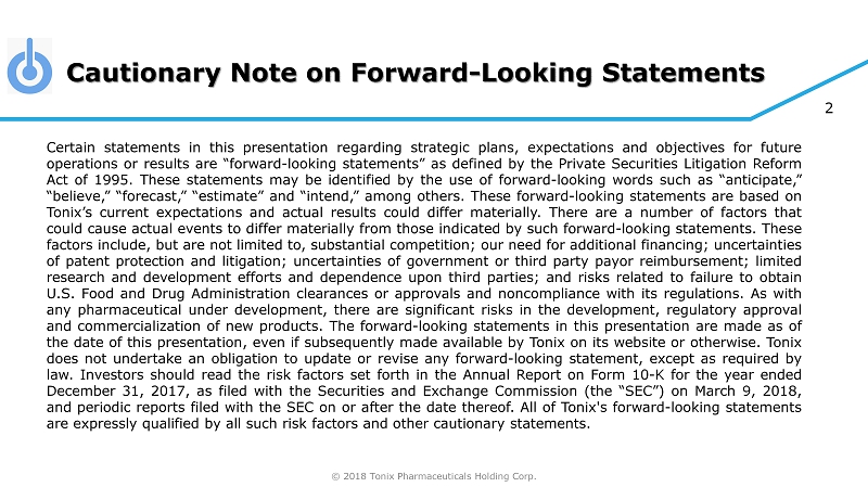 © 2018 Tonix Pharmaceuticals Holding Corp. 2 Cautionary Note on Forward - Looking Statements Certain statements in this presentation regarding strategic plans, expectations and objectives for future operations or results are “forward - looking statements” as defined by the Private Securities Litigation Reform Act of 1995 . These statements may be identified by the use of forward - looking words such as “anticipate,” “believe,” “forecast,” “estimate” and “intend,” among others . These forward - looking statements are based on Tonix’s current expectations and actual results could differ materially . There are a number of factors that could cause actual events to differ materially from those indicated by such forward - looking statements . These factors include, but are not limited to, substantial competition ; our need for additional financing ; uncertainties of patent protection and litigation ; uncertainties of government or third party payor reimbursement ; limited research and development efforts and dependence upon third parties ; and risks related to failure to obtain U . S . Food and Drug Administration clearances or approvals and noncompliance with its regulations . As with any pharmaceutical under development, there are significant risks in the development, regulatory approval and commercialization of new products . The forward - looking statements in this presentation are made as of the date of this presentation, even if subsequently made available by Tonix on its website or otherwise . Tonix does not undertake an obligation to update or revise any forward - looking statement, except as required by law . Investors should read the risk factors set forth in the Annual Report on Form 10 - K for the year ended December 31 , 2017 , as filed with the Securities and Exchange Commission (the “SEC”) on March 9 , 2018 , and periodic reports filed with the SEC on or after the date thereof . All of Tonix's forward - looking statements are expressly qualified by all such risk factors and other cautionary statements .