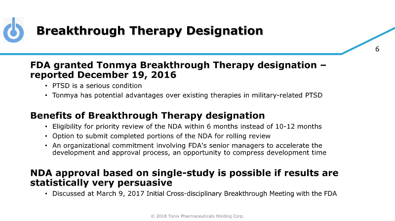 © 2018 Tonix Pharmaceuticals Holding Corp. 5 Tonmya for PTSD Breakthrough Therapy (BT) designation from the FDA • Expedited development and accelerated approval are expected One Phase 2 study completed and one Phase 3 study stopped early due to inadequate separation from placebo • Both studies were accepted by the FDA as potential pivotal efficacy studies in military - related PTSD if successful • No safety or tolerability concerns • Phase 2 study (P201) formed the basis of BT designation • Phase 3 study (P301) provided evidence of effectiveness as early as 4 weeks after treatment but diminished over time due to high placebo response − Retrospective analysis showed Tonmya response in subgroup with trauma ≤9 years from screening Expecting FDA feedback and agreement on a new Phase 3 trial in 4Q2018 • Potential NDA 1 approval can be based on one Phase 3 study Patent protection through 2034 in U.S. 2 • Composition of matter patent for transmucosal delivery of cyclobenzaprine Novel mechanism targets sleep quality • Memory processing during sleep is important to recovery from PTSD 1 NDA = New Drug Application 2 U .S. Patent No. 9,636,408 for eutectic proprietary Protectic ™ formulation